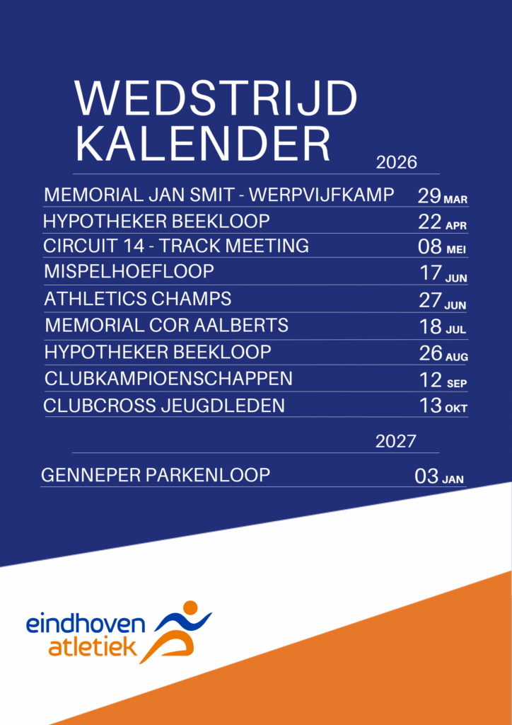 Wedstrijdkalender Wedstrijdkalender Eindhoven AtletiekDe data van de Eindhovense atletiek- en hardloopwedstrijden in 2026 zijn bekend. Zet ze in de agenda, we hopen vele EA-tenues te zien schitteren!Wedstrijd Organisatie Commissie (WOC) Lees meer artikelen Vorig berichtNieuwsflits maart 2026 Volgend berichtIngeschreven voor Marathon Eindhoven? Train dan vanaf 9 mei met ons mee! Dit vind je vast ook leuk Meer dan 1000 deelnemers aan Hypotheker-Beekloop 25 april 2025 20 augustus: Hypotheker-Beekloop 18 augustus 2025 Harry Schulting Games in Vught 30 mei 2025